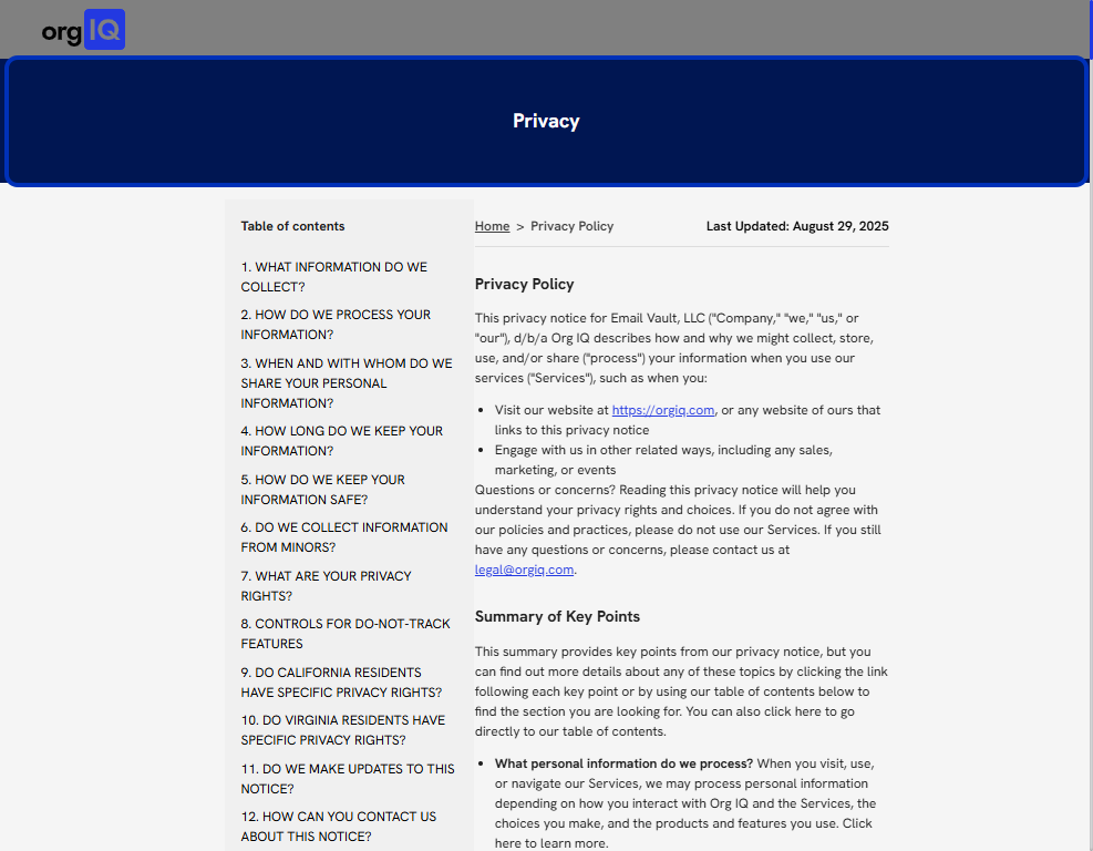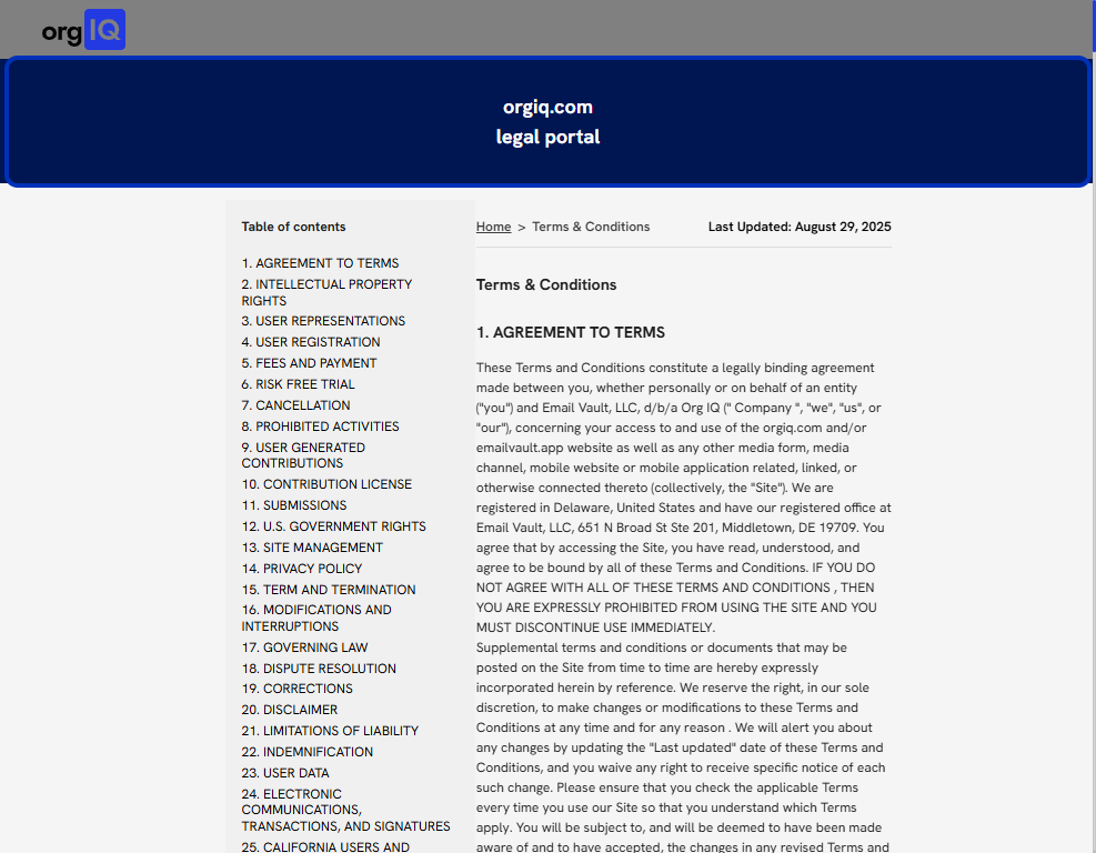 This article will guide you through how to access the Privacy Policy and Terms and Conditions in Org IQ. Reviewing these documents helps you understand how your data is managed and the terms governing your account usage.