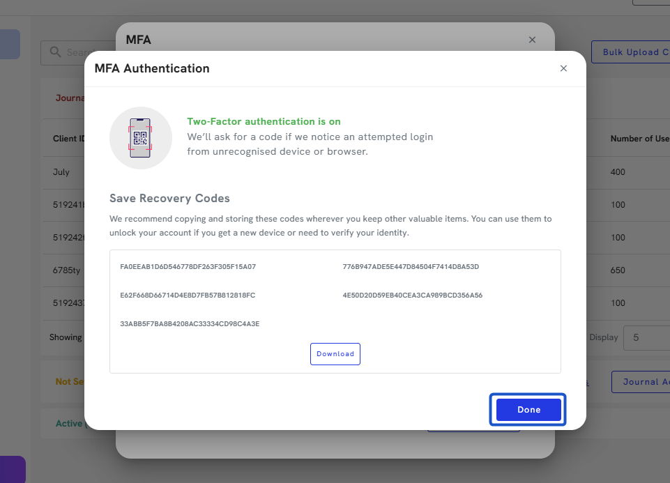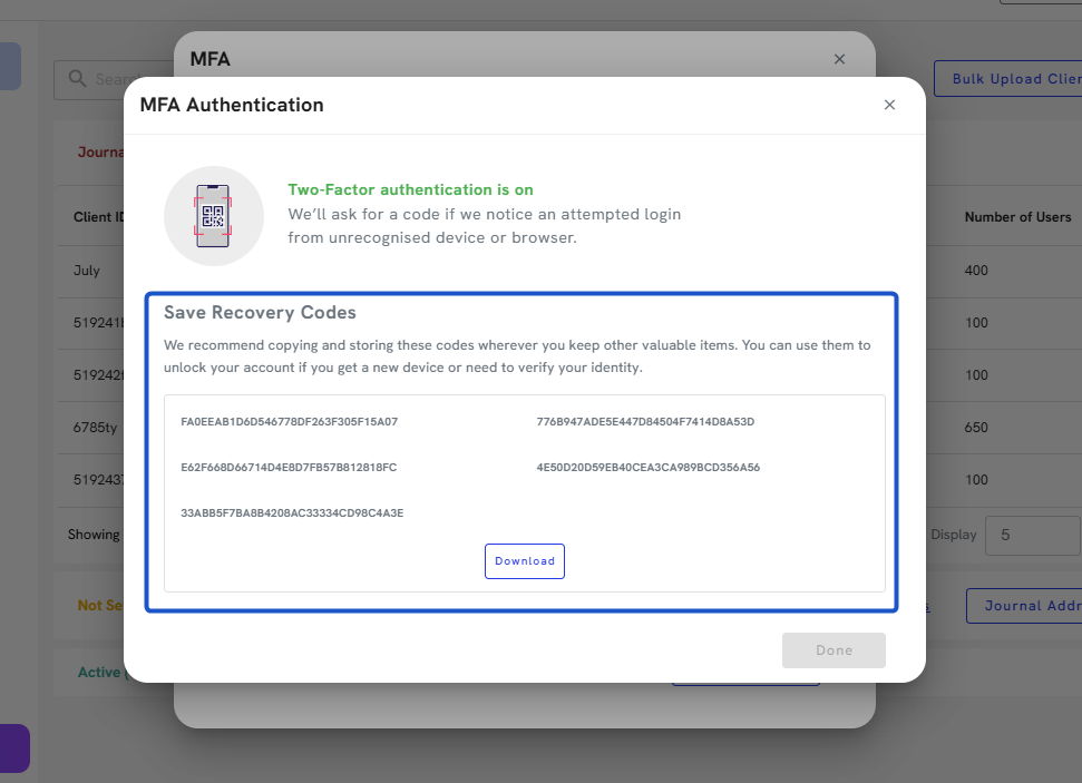 11. Org IQ will provide you with your recovery codes so you can access your account in case something goes wrong with your authentication app.