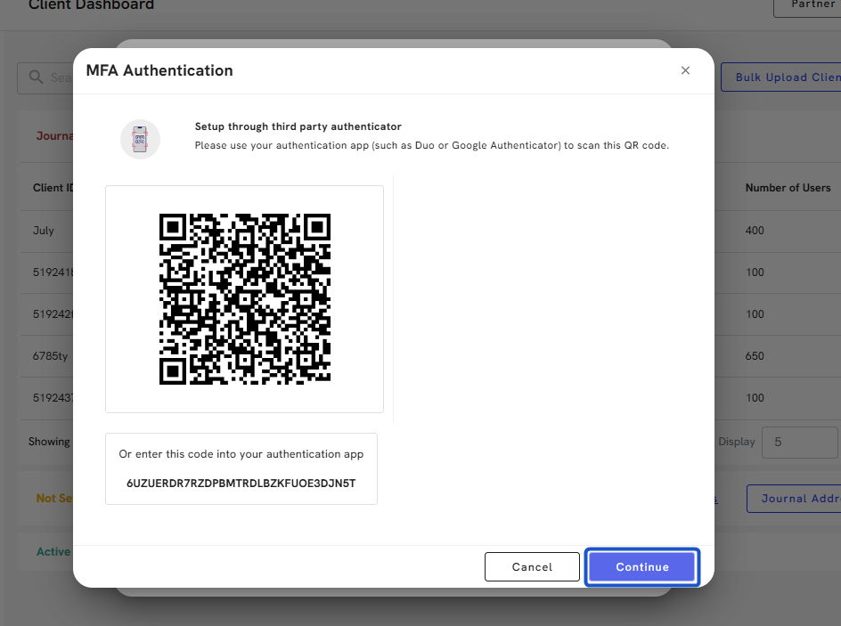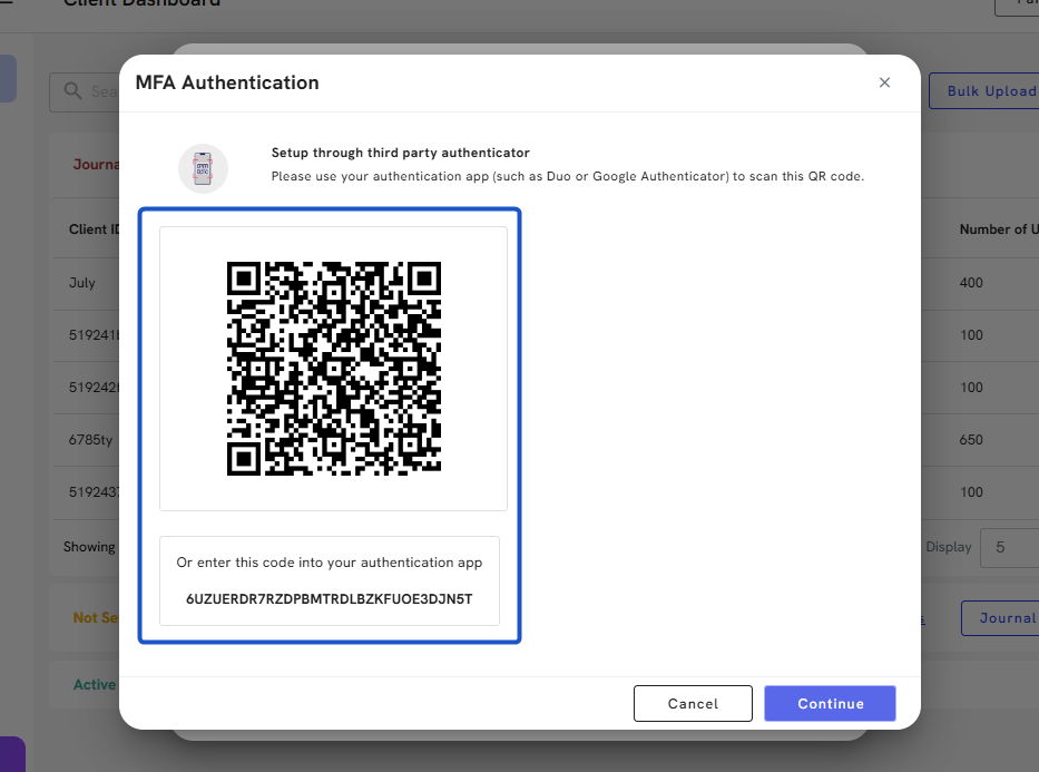 7. Using your phone, download an authentication app, like Google Authenticator, and scan the QR code or enter the unique code provided.