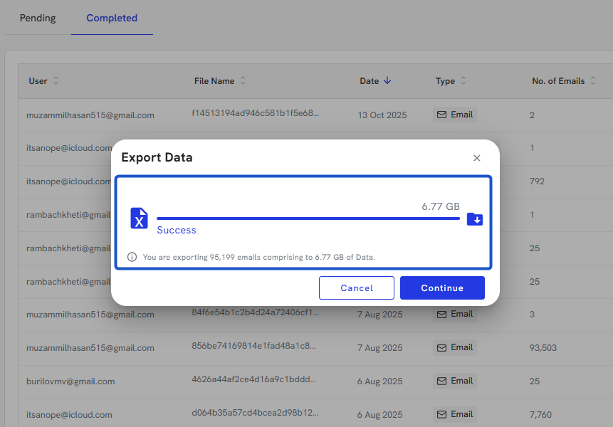 8. You will see the number of emails and file sizes whenever you export.