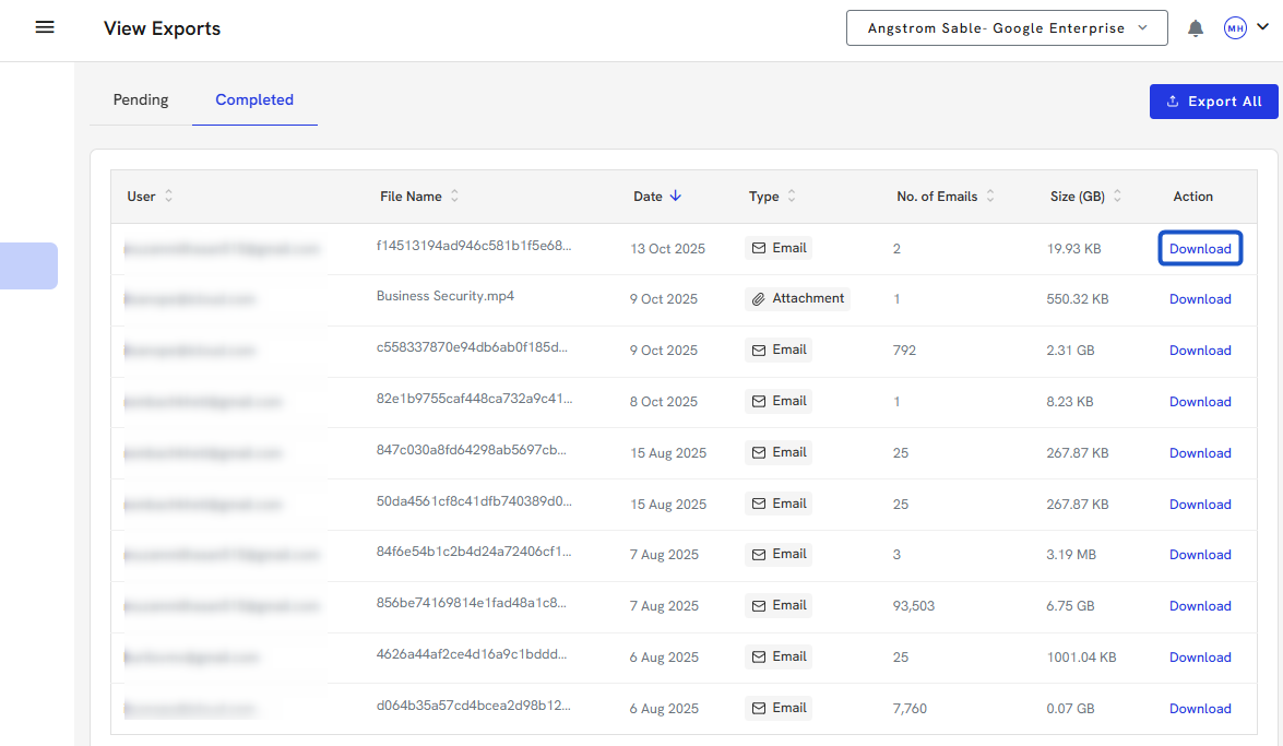 5. Click on Export All if you wish to download all of your emails.
