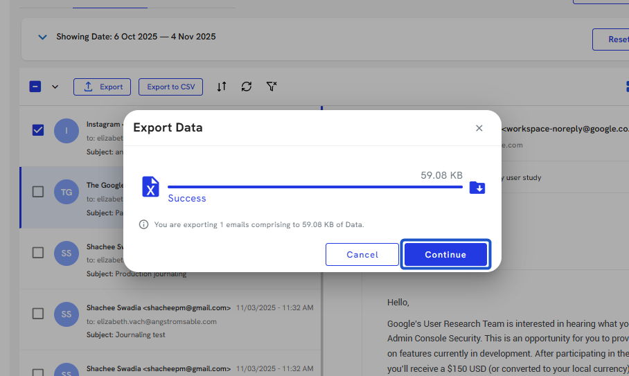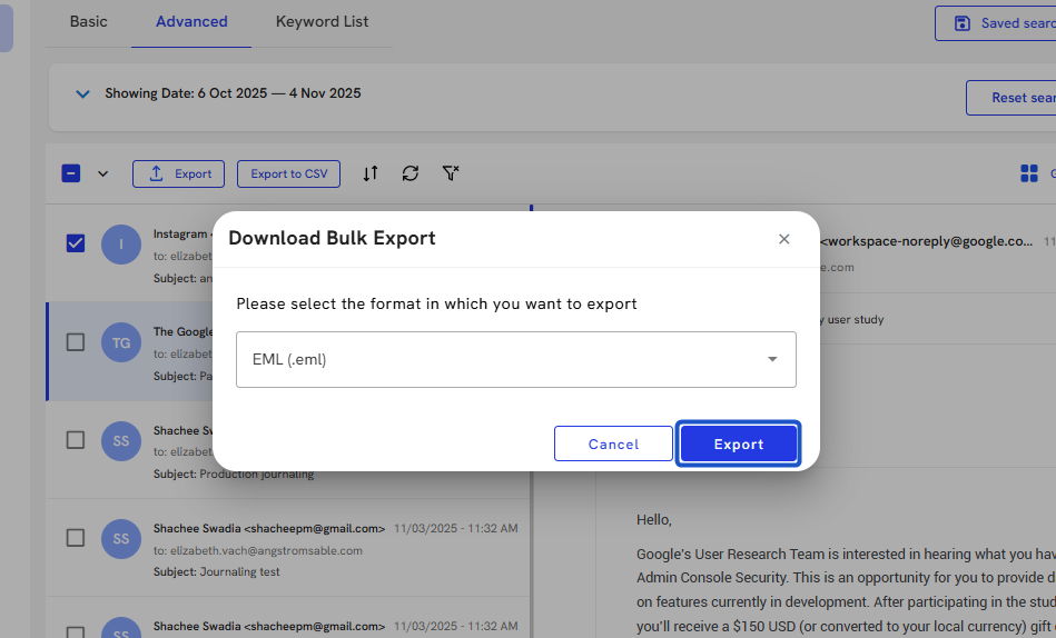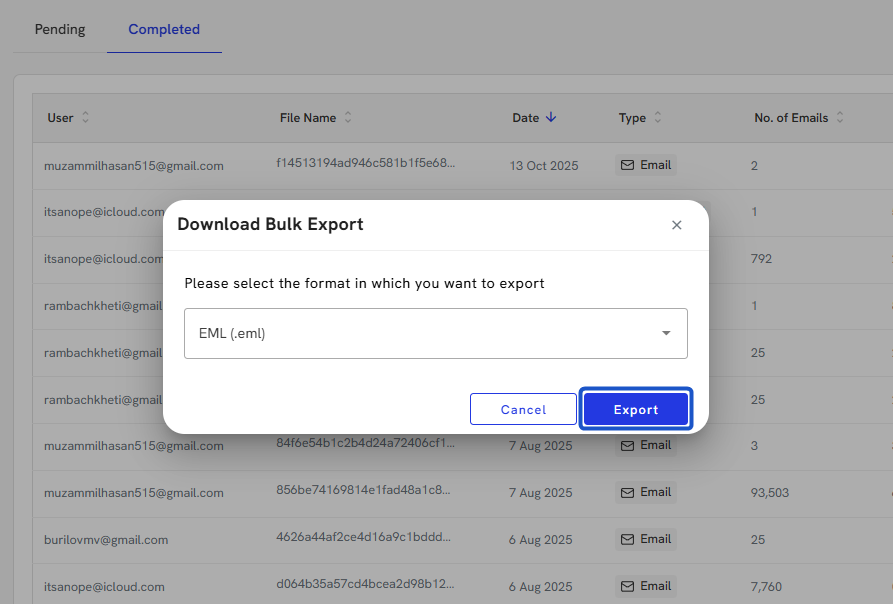 18. Click on Export emails once your selection has been made.