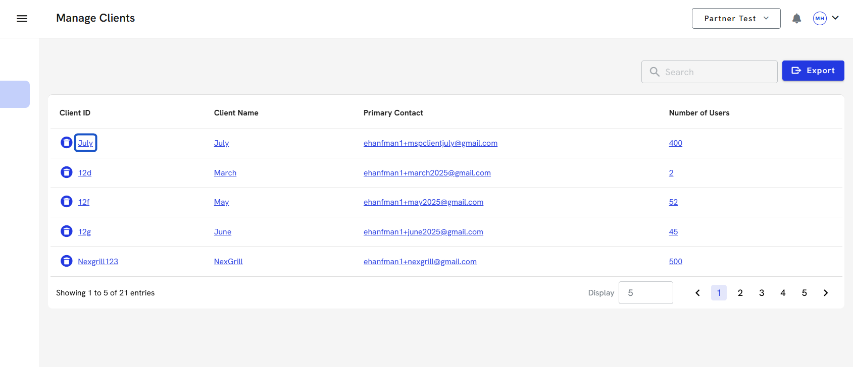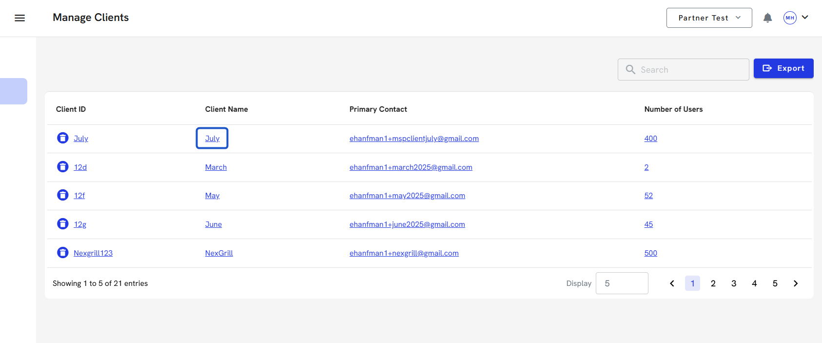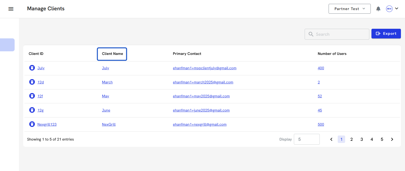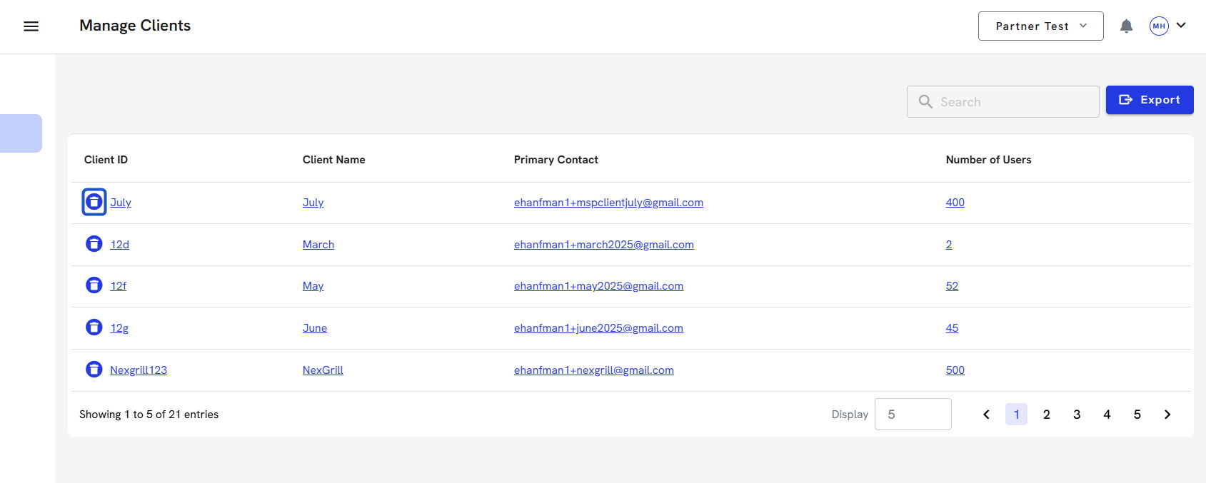 7. To delete a client account, click on the Trash can icon. You can export all the client's information before you delete their account. You can also do this directly in the client's account.