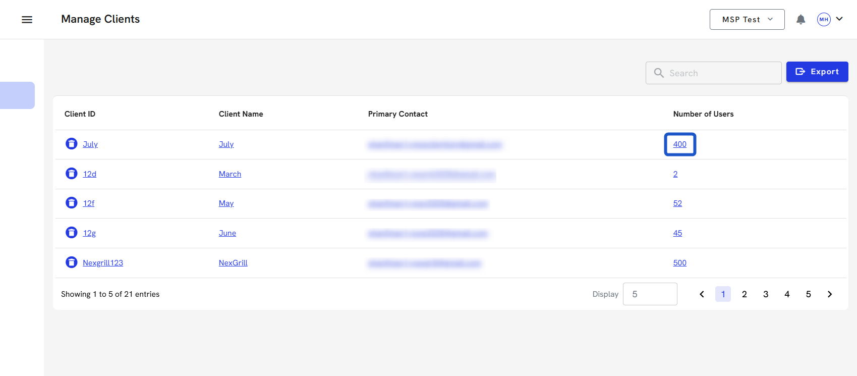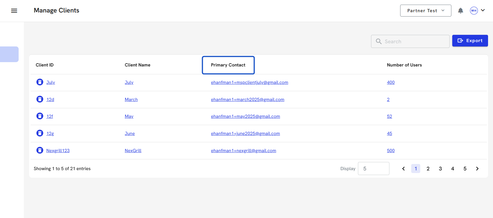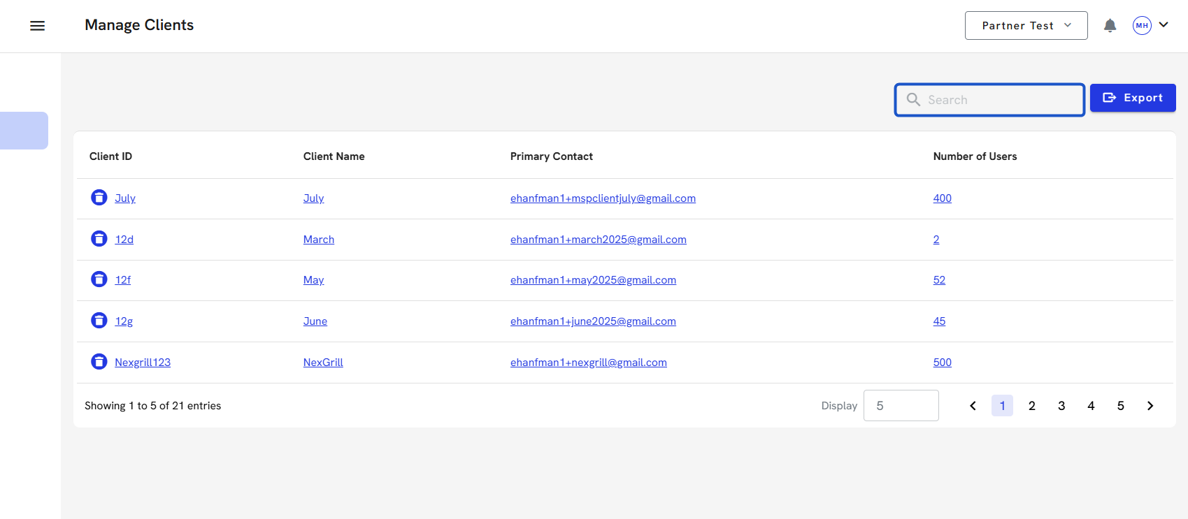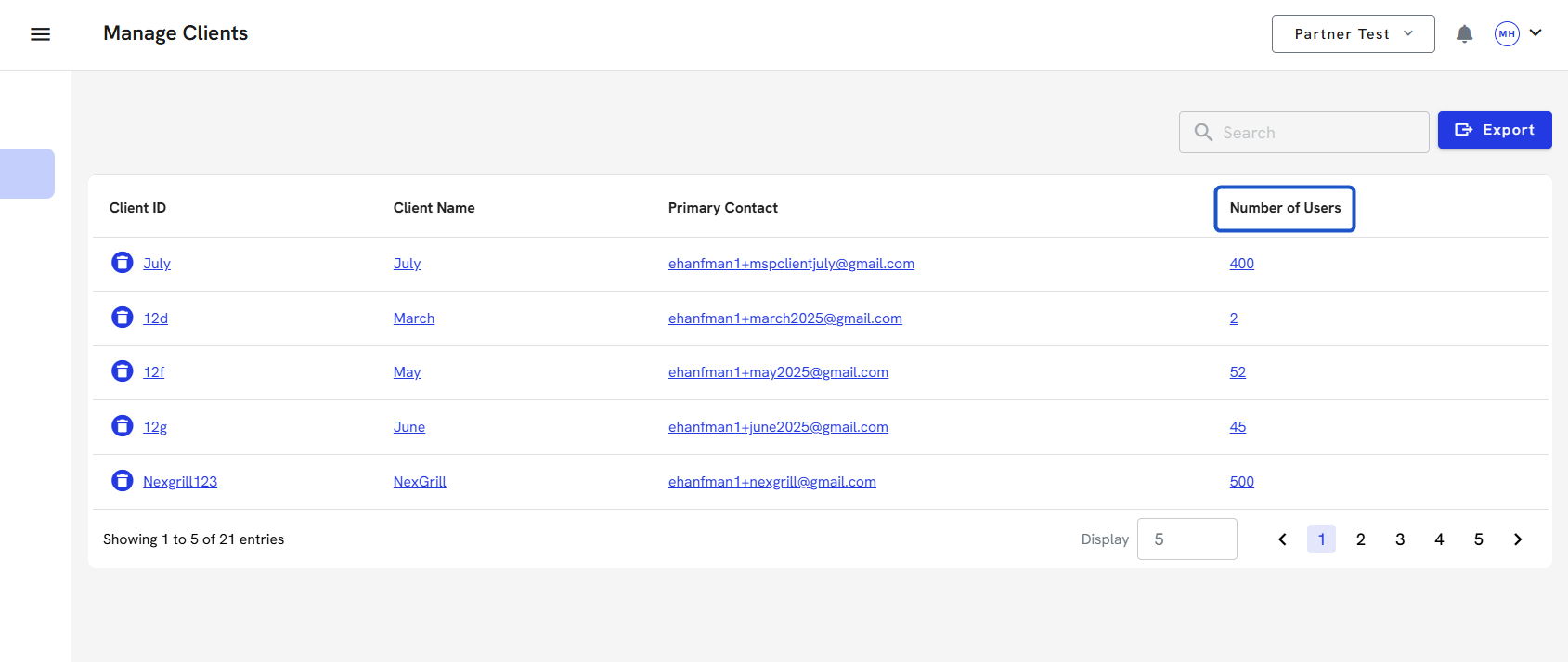 7. To delete a client account, click on the Trash can icon. You can export all the client's information before you delete their account. You can also do this directly in the client's account.