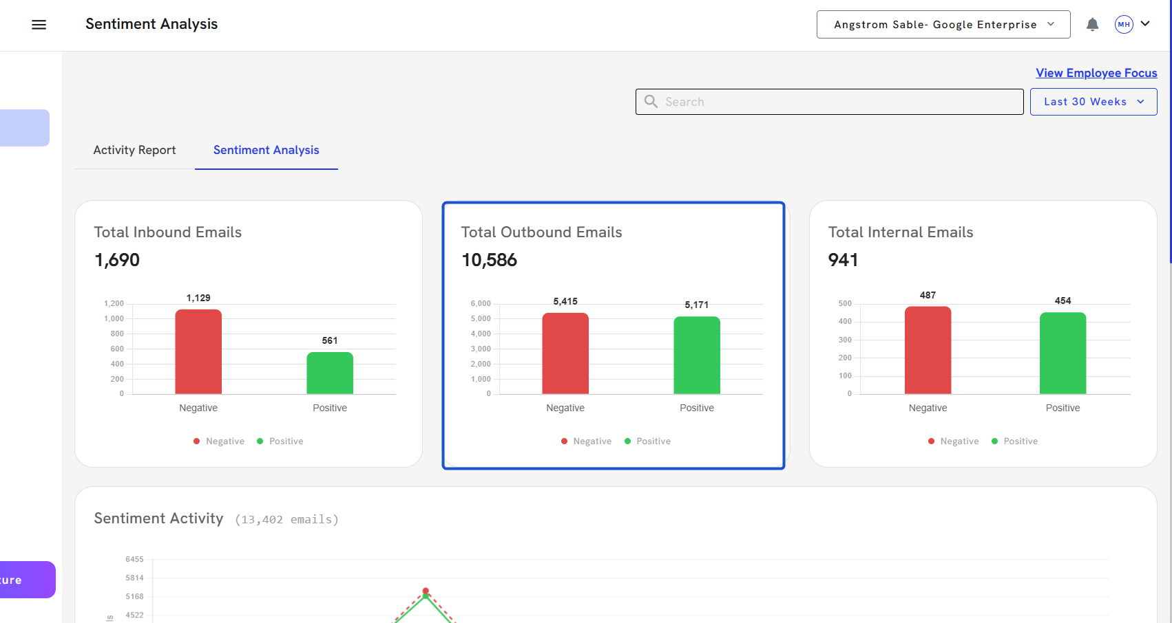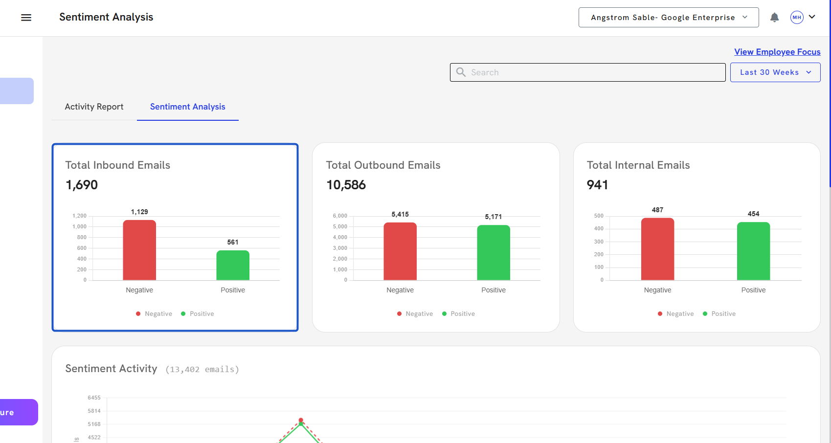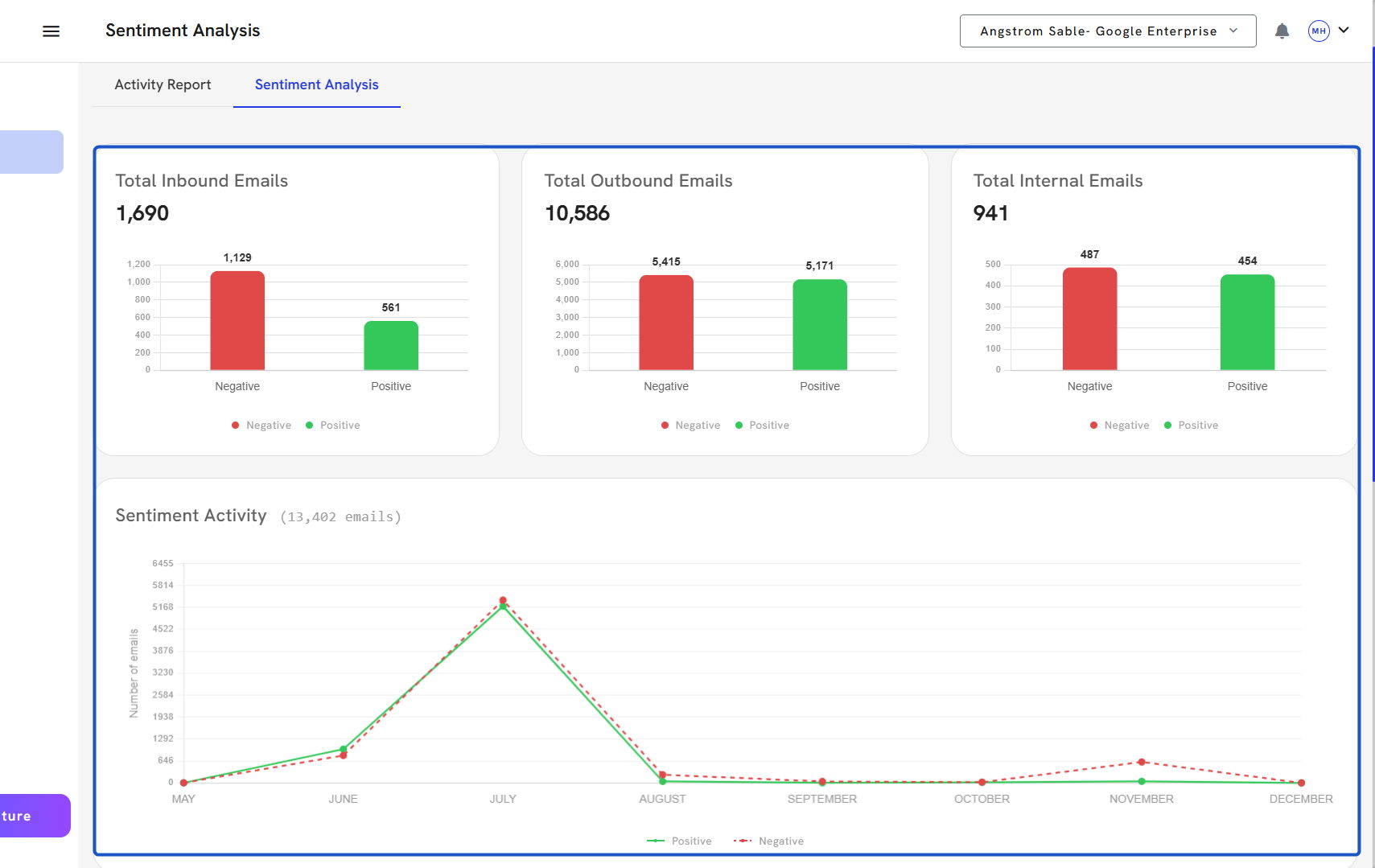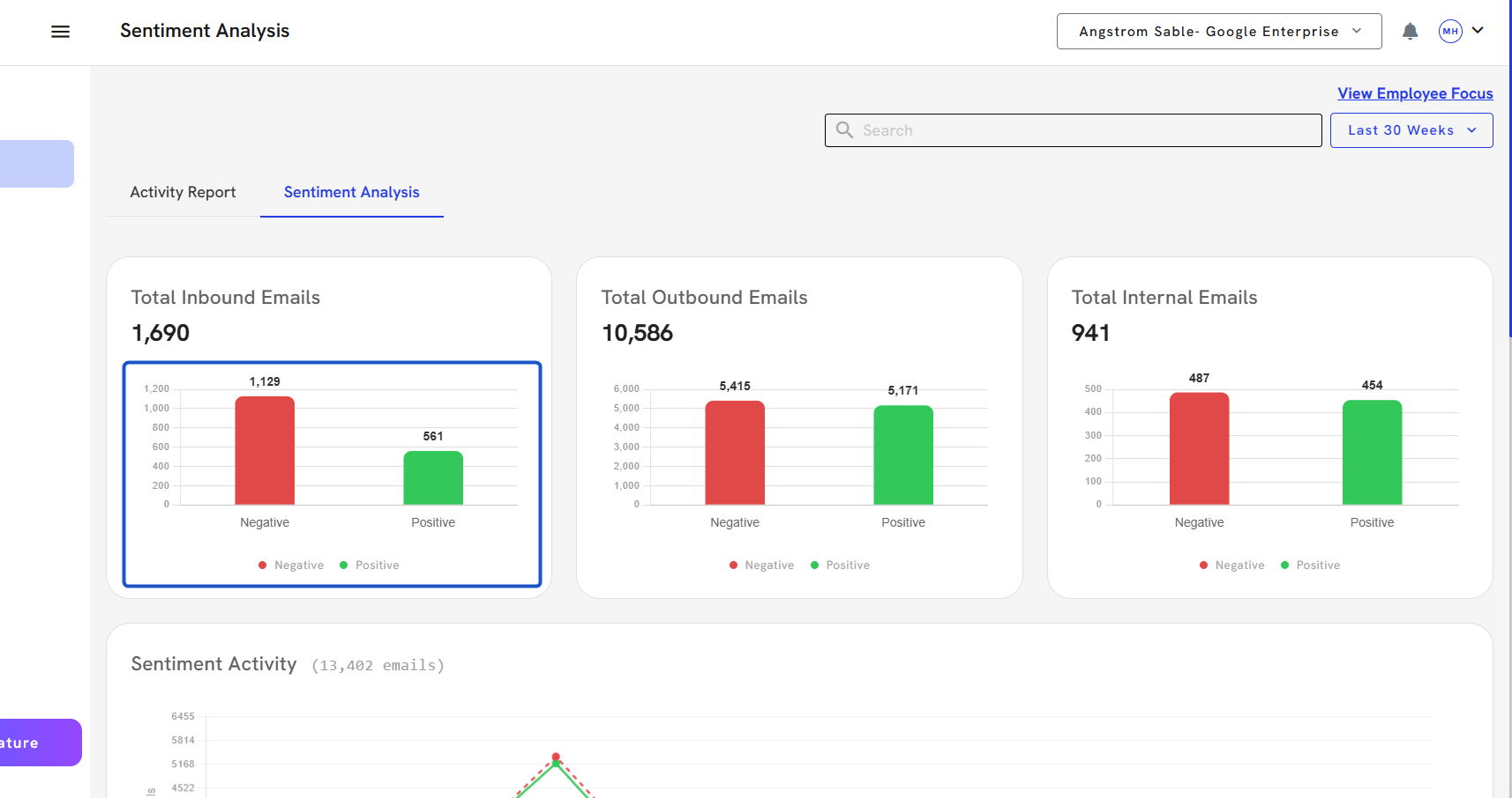 The Sentiment Analysis page provides a high-level summary of your organization’s email sentiment over a selected time frame. It helps teams understand communication tone across inbound, outbound, and internal email flows.
