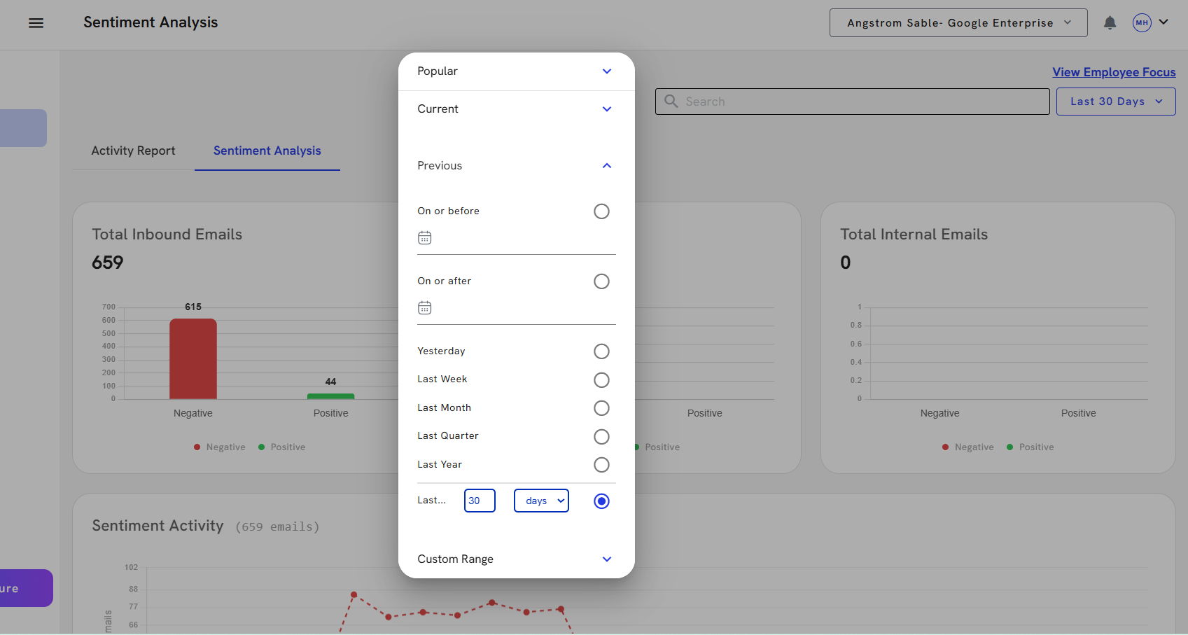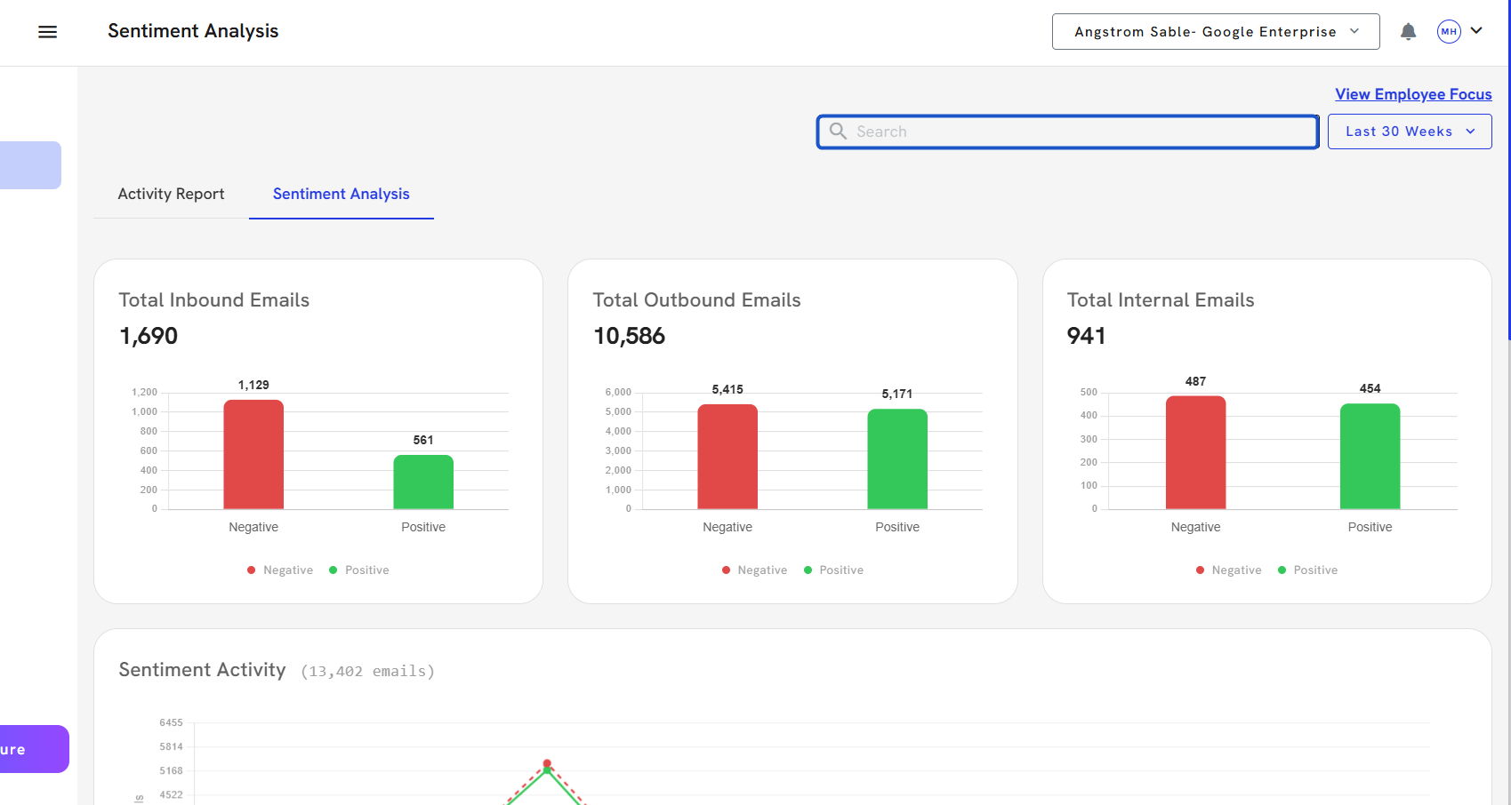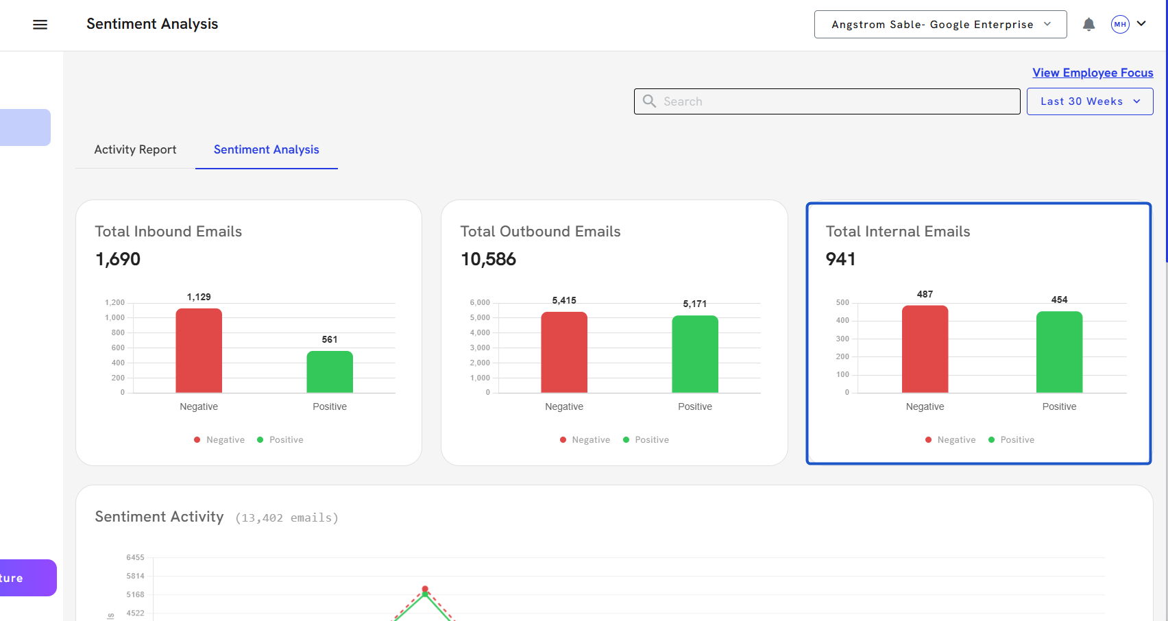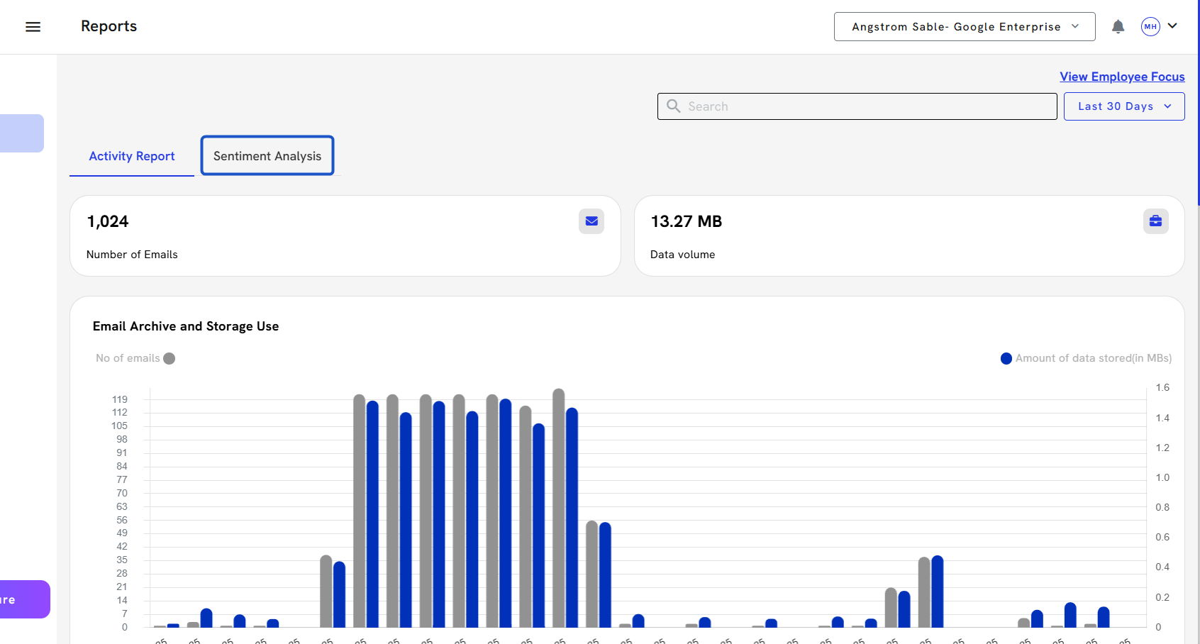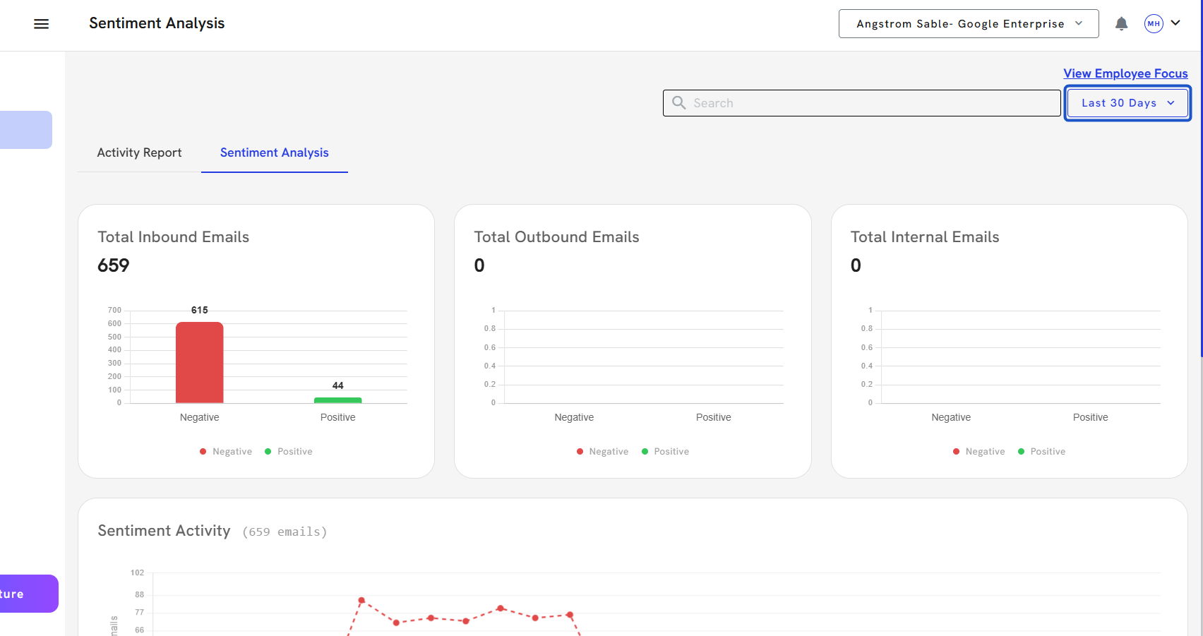The Sentiment Analysis page provides a high-level summary of your organization’s email sentiment over a selected time frame. It helps teams understand communication tone across inbound, outbound, and internal email flows.