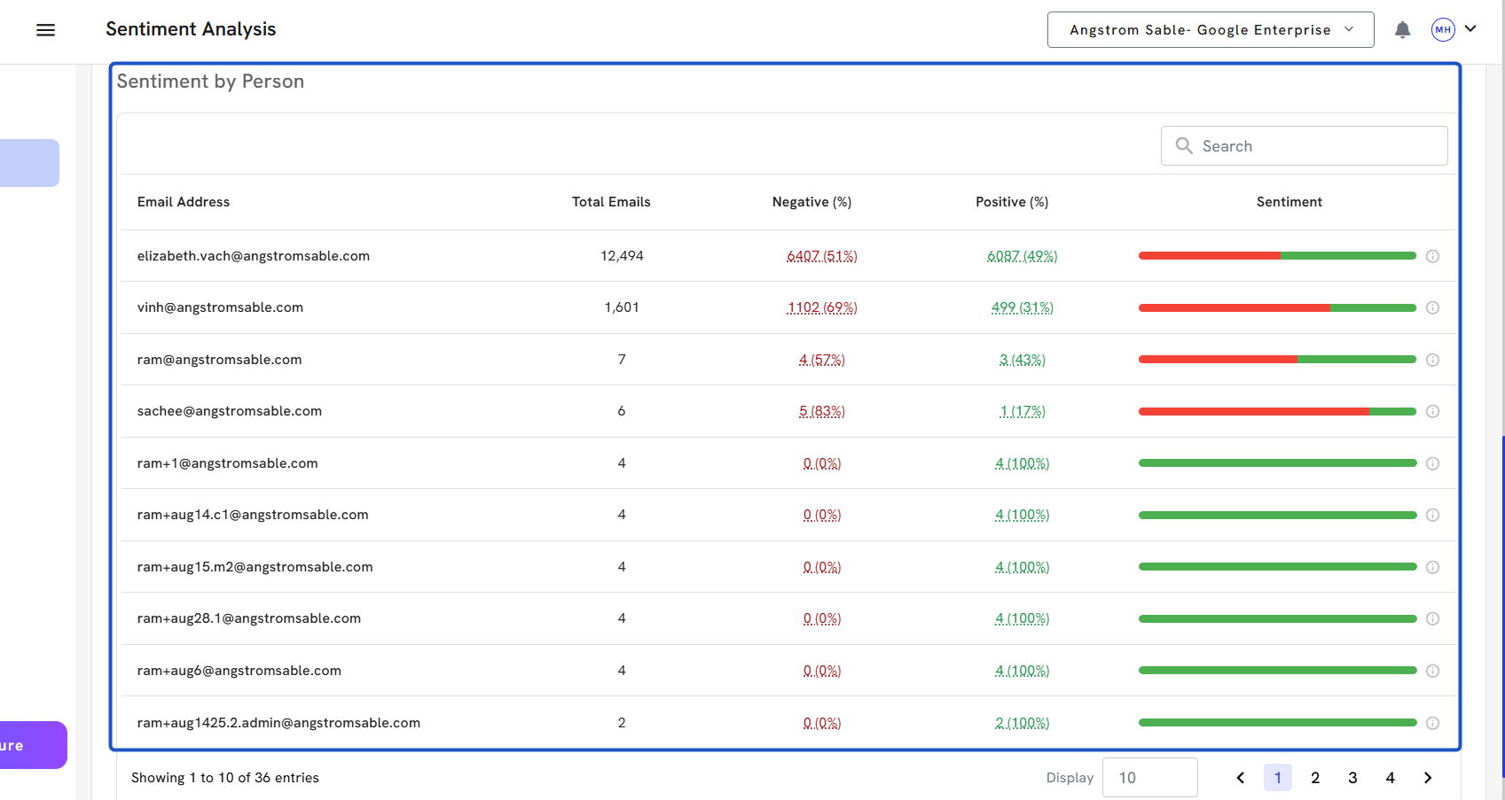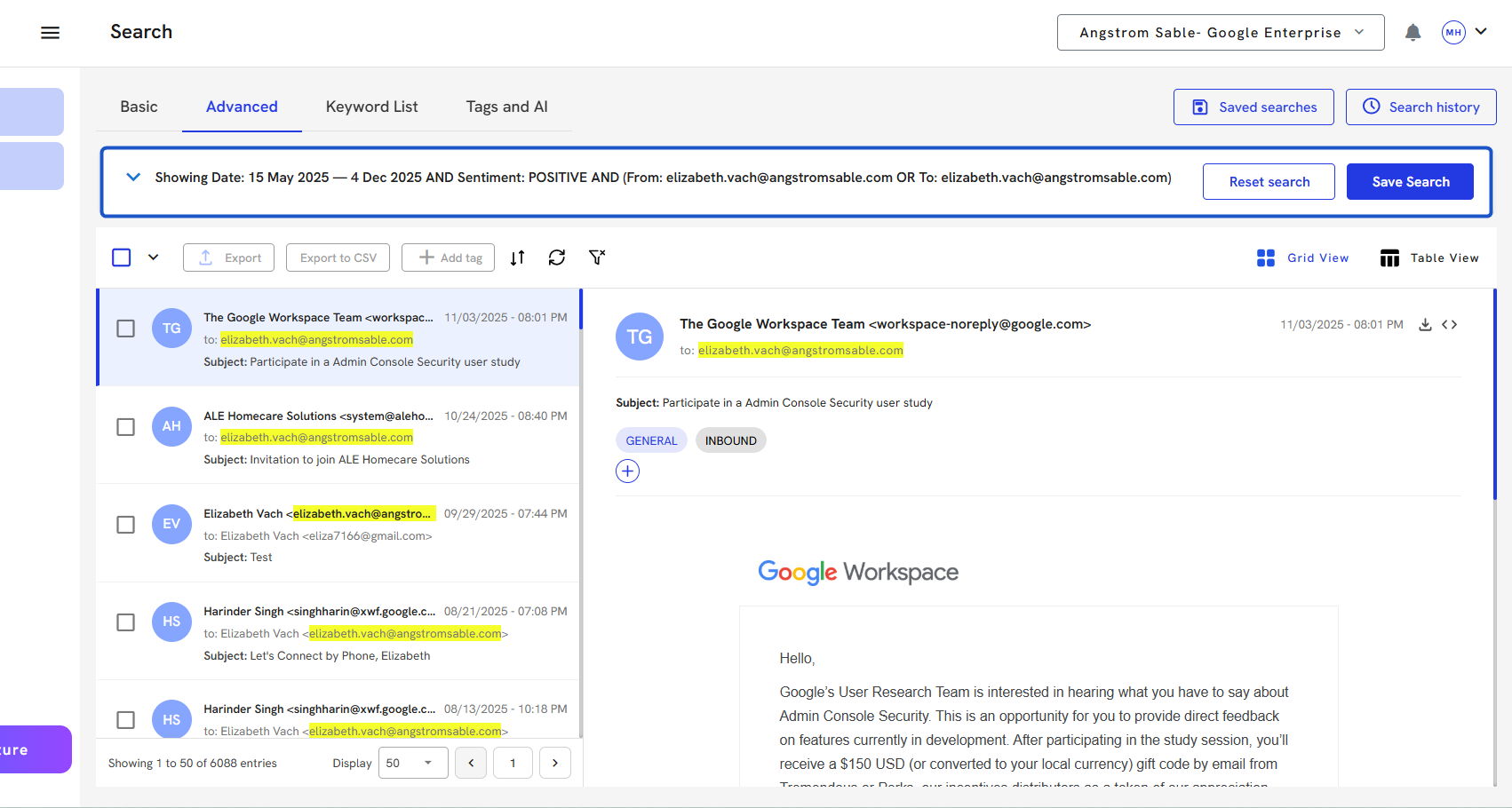 3. The interface will display filtered emails in the Search Mail panel, showing only those that match your selected sentiment, direction, and email address.