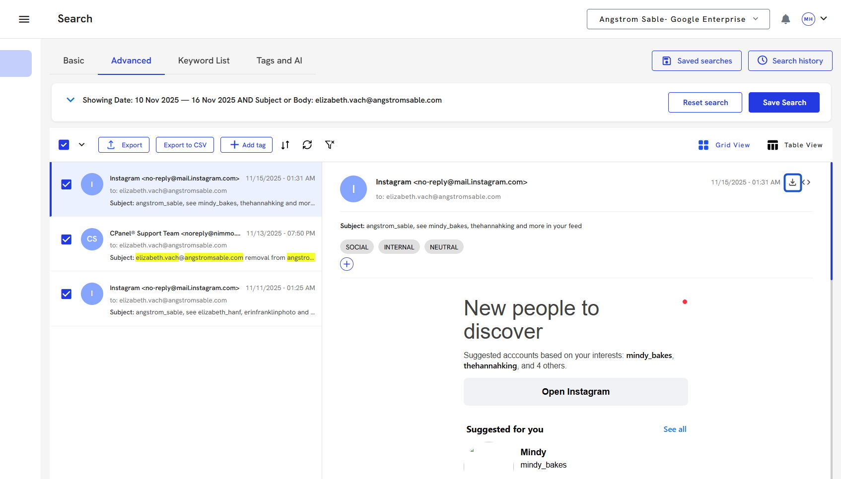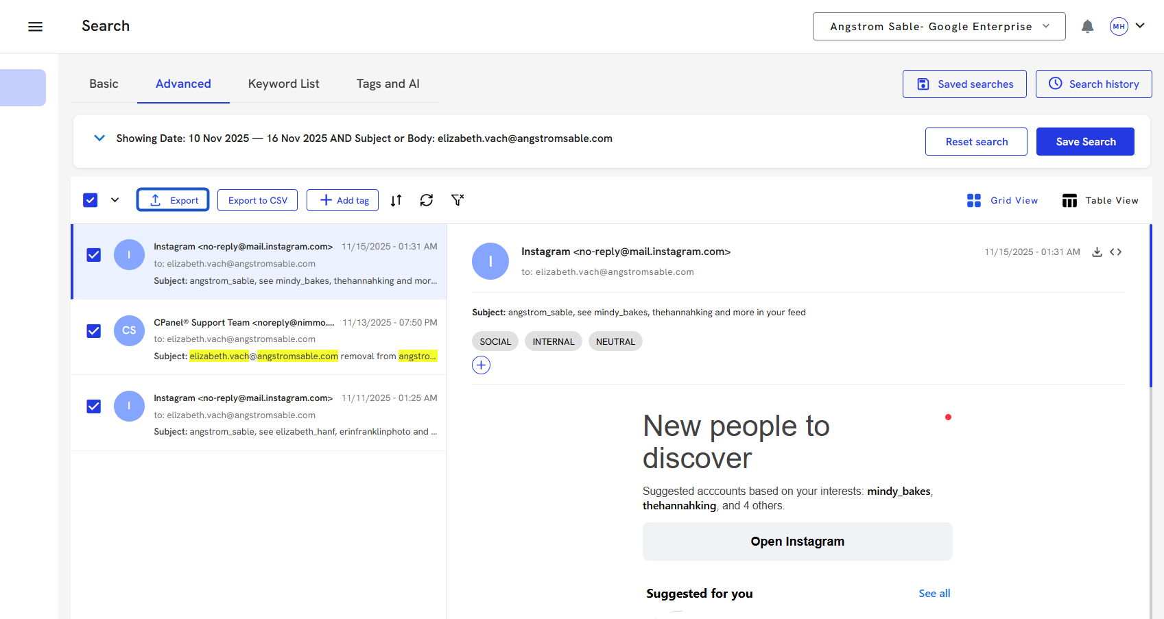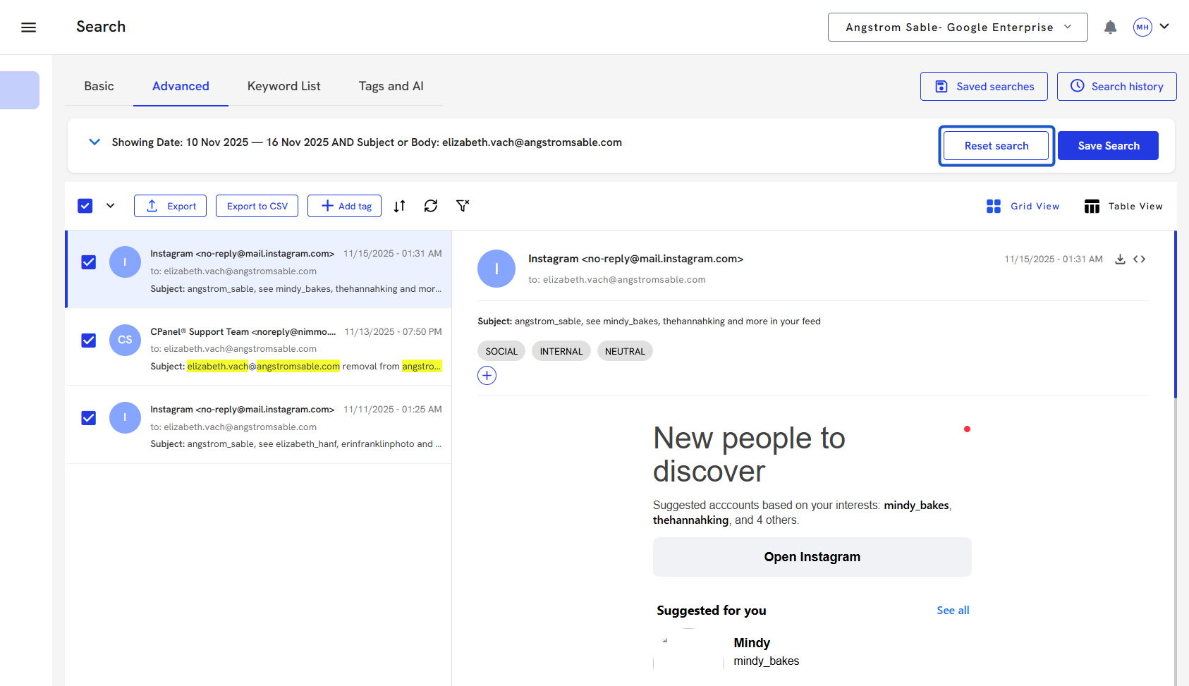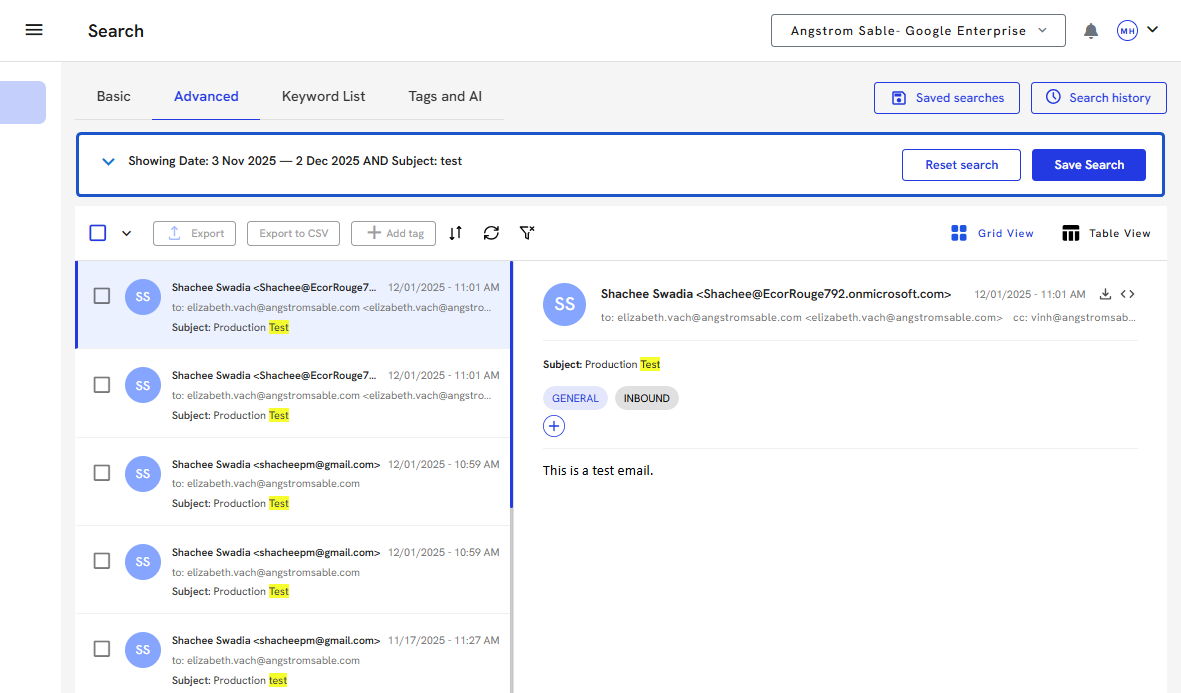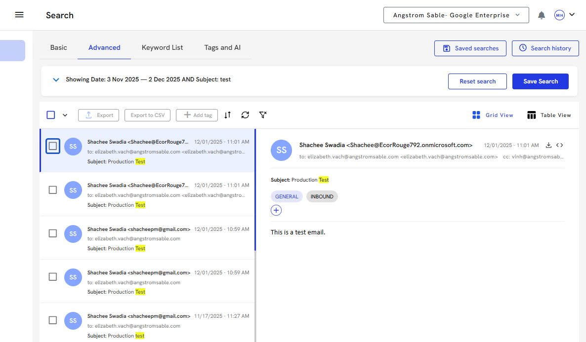 15. Once the search has been run, you will see the search criteria at the top and a list of all the emails that contain your search criteria.
