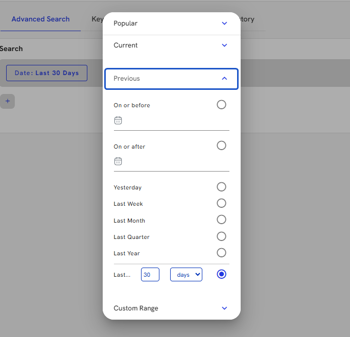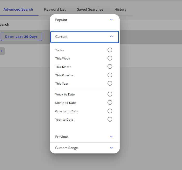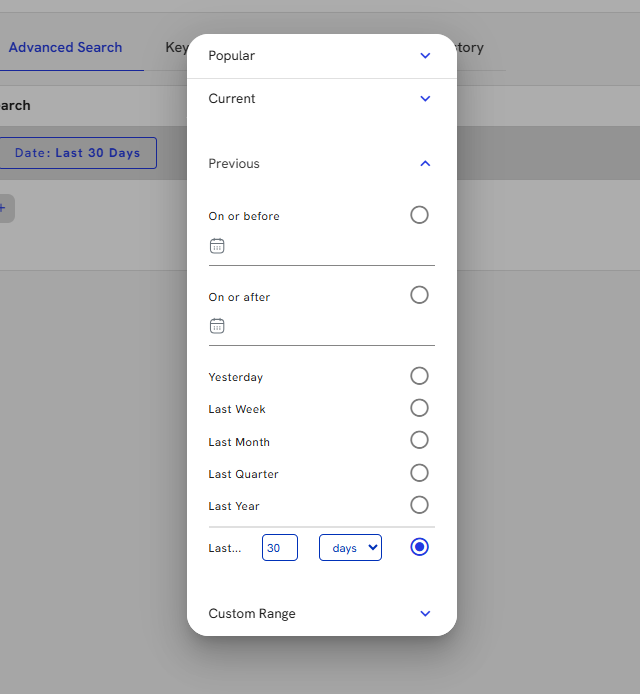 4. To update the date criteria, click on the chip, and a date window opens, offering a multitude of quick searches as well as a custom date option.
